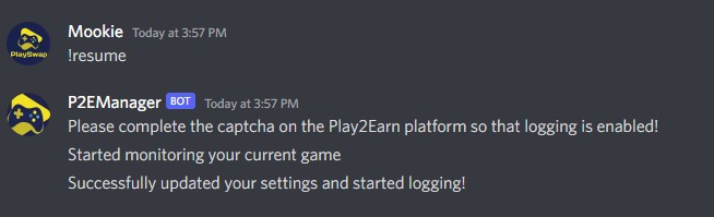 - Bellow, you can find an example of the !resume message you need to send to the P2EManager bot: